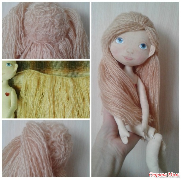 Затем пришла пора примерять прическу. Волосы я сделала из пряжи, макушку приподняла «очесами» от пряжи и короткими ниточками «методом приваливания».
