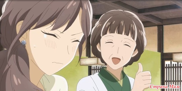 Очень приятный опенинг, можно сказать он начинает вас окутывать, затаскивает в историю и уже не отпускает. Это и не "Брошенный кролик", ведь папаша из Ногомо никакой и не "Гостиница Окко" здесь девочка чувствует себя одинокой, мне её чувства больше напомнил и о "Азбука цветов". Очень милое и вместе с тем с лучиками юмора история на очень серьёзную тему.