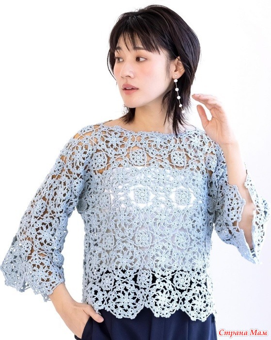 Голубой джемпер из круглых ажурных мотивов разного диаметра.
