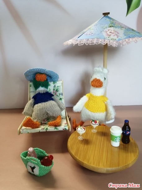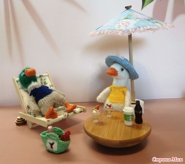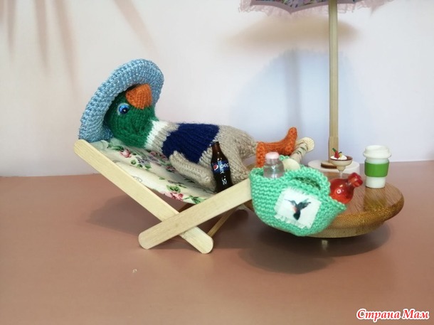 Круто , селезень так удобно устроился на шезлонге и уточке в тенёчке под зонтиком тоже комфортно .