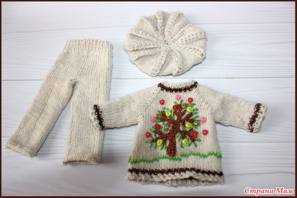 Когда-то давно для внучки своей подруги я вязала пуловер с пуговичным деревом-https://www.stranamam.ru/post/9650253/ , вот и для куклы решила связать что-то похожее... Вязала из Семеновской полушерстяной пряжи пряжи Ольга- в 100 г 392 м, спицы 2,5 мм. Получился комплект