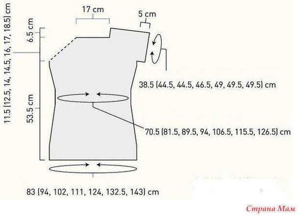 Продолжить по рисунку, повторить круг. р. убавок в каждом 8 (8, 8, 6, 6, 6, 6)-м круг. ряду еще 5 (5, 5, 7, 7, 7, 7) раз = 166 (186, 202, 210, 234, 250, 270) п., по 83 (93, 101, 105, 117, 125, 135) п. для переда и спинки. Длина полотна должна составить примерно 15 (15, 15, 16, 16, 16, 16) см от разделительного ряда.