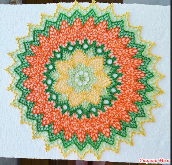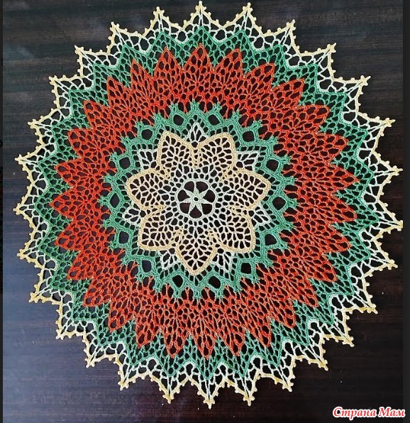 Соскучилась я по крючку и вот попалась мне на просторах интернета салфетка разноцветная. Ну а так как я все продолжаю пристраивать остатки, то решила ее связать. Нитки Ярнарт виолет, 282м/50 гр, крючок 1,2, диаметр 56 см. Вязала по схеме, но в результате салфетка почему-то фалдила, поэтому при блокировке пришлось края делать острыми, а не полукруглыми как в оригинале. Если бы вязала ее снова, то центр сделала бы из 6 лепестков, а не из 7-ми как на схеме.