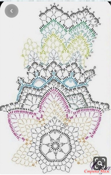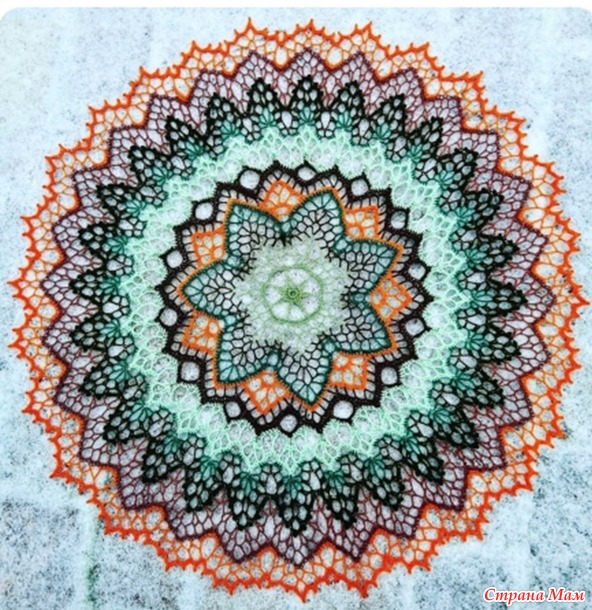 Соскучилась я по крючку и вот попалась мне на просторах интернета салфетка разноцветная. Ну а так как я все продолжаю пристраивать остатки, то решила ее связать. Нитки Ярнарт виолет, 282м/50 гр, крючок 1,2, диаметр 56 см. Вязала по схеме, но в результате салфетка почему-то фалдила, поэтому при блокировке пришлось края делать острыми, а не полукруглыми как в оригинале. Если бы вязала ее снова, то центр сделала бы из 6 лепестков, а не из 7-ми как на схеме.