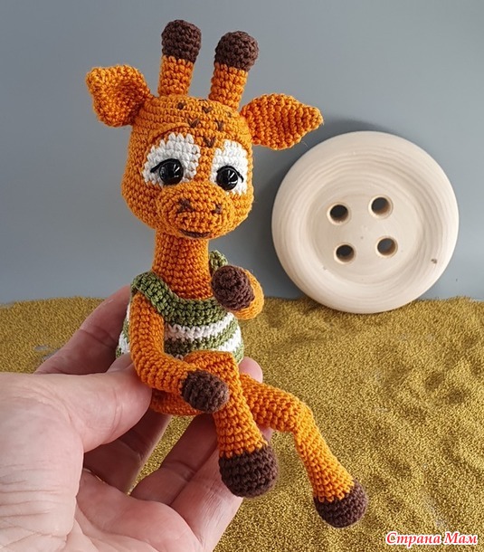 Малыш связан из хлопка, крючок 1,5, голова вращается, рост с рожками сидя 11см, глазки безопасные, ручки на каркасе, маечка снимается, застегивается на кнопку.