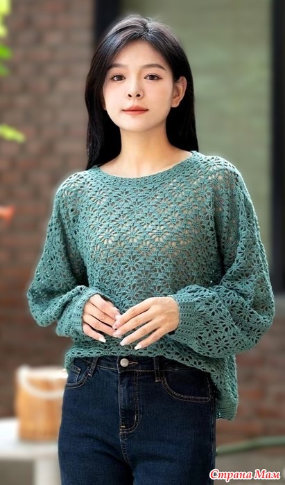 Ажурный джемпер с круглым вырезом и рукавами на манжетах имеет силуэт оверсайз и вяжется классическим узором паучки.