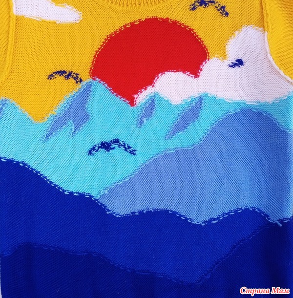 Весной получила заказ от дочери: "Что ты все внукам, да внукам. Свяжи мне такой же!" Сначала отнекивалась, а потом решила, а почему бы и не попробовать. Картинка, правда, сначала планировалась другая. Итальянское морское побережье. Но она категорически не подошла по формату. Пришлось срочно искать замену. Остановилась вот на таком варианте. Допроситься фотографии на фигуре не могу. Там свои дела. Первые денечки в садике и в ясельках. В общем, не до меня. Поэтому похвастаюсь хоть картинкой.