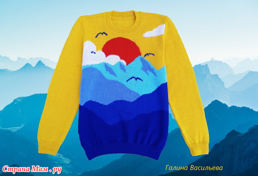 Весной получила заказ от дочери: "Что ты все внукам, да внукам. Свяжи мне такой же!" Сначала отнекивалась, а потом решила, а почему бы и не попробовать. Картинка, правда, сначала планировалась другая. Итальянское морское побережье. Но она категорически не подошла по формату. Пришлось срочно искать замену. Остановилась вот на таком варианте. Допроситься фотографии на фигуре не могу. Там свои дела. Первые денечки в садике и в ясельках. В общем, не до меня. Поэтому похвастаюсь хоть картинкой.
