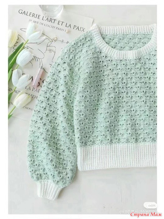 Этот джемпер нежного мятного цвета с белой окантовкой смотрится очень мило, а вяжется очень просто.