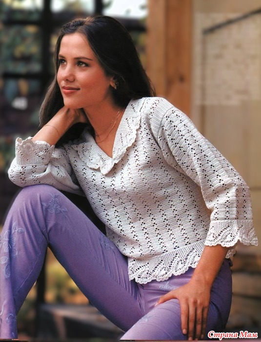 Белый джемпер ретро в филейной технике с красивой отделкой подола рукавов и выреза горловины.