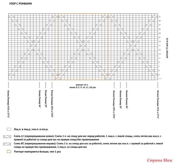 • Узор с косами вяжется по Схеме узор. При вязании круг.р. схему читать справа налево. При вязании прямыми рядами лиц.р. (нечетные) читать справа налево, изн.р. (четные) читать слева направо.