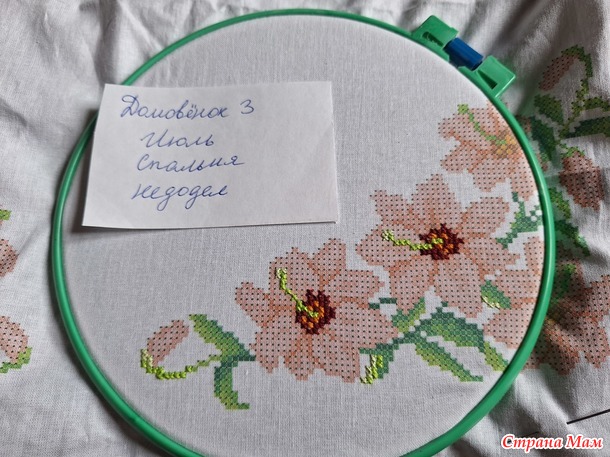 Проект для спальни у меня был определён ещё с начала года. В прошлом Домовёнке я начинала вышивать салфетку и остановилась на середине, не успевала доделать из-за проектов других месяцев. И когда Наташа нам разрешила использовать недодел, я была очень рада, а то так руки бы и не дошли доделать эту салфетку.