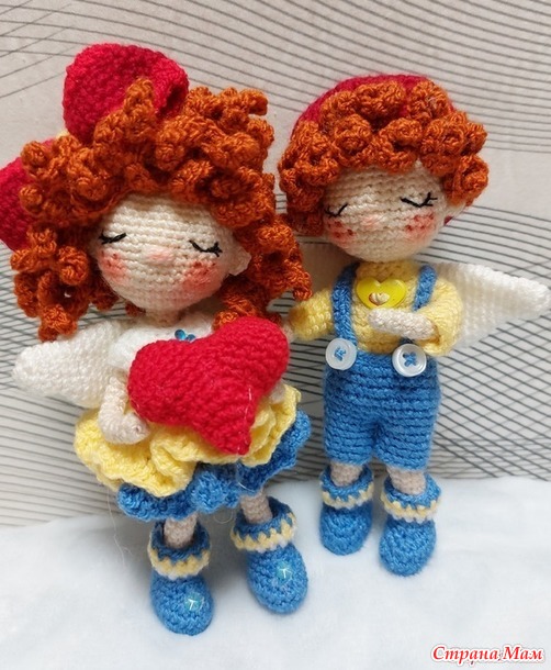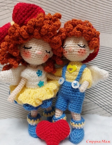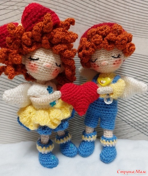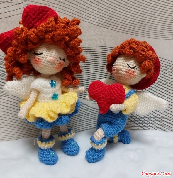 . Вот и очередная парочка,связанная по МК от Huong Nguyen готова к показу. Ангелочки по 14 см ростиком,на проволочном каркасе съемные только бантик и беретик.