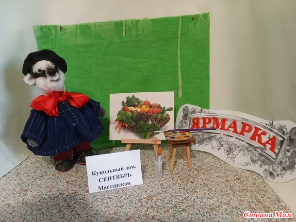 После нарядов решено взяться за оформление вывески для осенней ярмарки. Мистер Баджер надел свою шикарную блузу художника с алым атласным бантом, взял палитру и давай малевать! Вывеска готова! И, конечно, заодно написал изумительный натюрморт – спелые,сочные овощи. Килограммов 5-6, не меньше! Если продаст на ярмарке – купит девчонкам гостинцы!