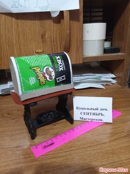 Футляр для машинки из круглой банки из-под чипсов. Ох и нравился мне этот«чемодан» в детстве! Кстати, делала всё «с натуры» - именно такая машинка и именно с таким футляром стоит у меня в кладовке. Реальное наследство от бабушки.