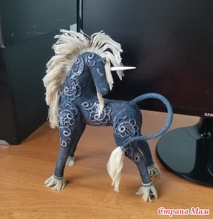 Людмила - e88810 Людмила сшила брутального Единорога (https://www.stranamam.ru/post/15206347/) из джинсовой ткани, изменила оформление и у нее получилась другая интерьерная игрушка.