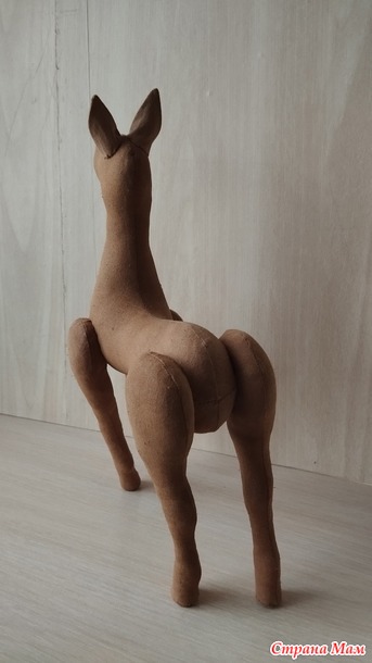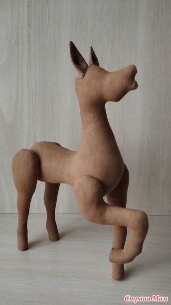 После высыхания стали видны полосы из-за разной плотности нитей. Пришлось наносить еще один слой кофейного грунта с добавлением краски. На фото видна разница в цвете грунтовки. Все запчасти игрушки прогрунтованы дважды. Первый грунт кофейный, второй кофе + краска. А рог только кофейным раствором.После полного высыхания нужно сшить все части. Так как наша игрушка будет статичной, то все ноги пришиваются сразу в нужном положении. Сначала примерьте, как будет стоять ваш Единорог, приколов ноги к телу портновскими булавками.