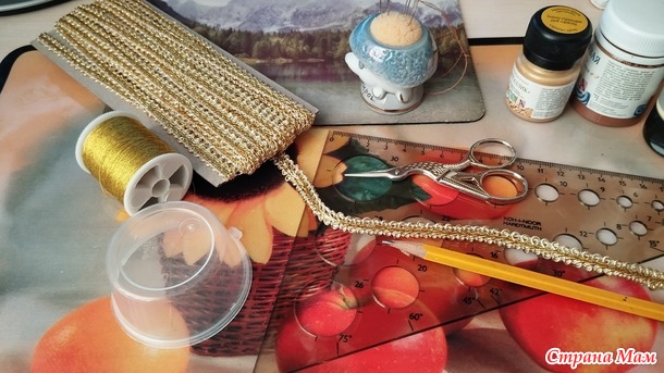 Нанесла линии рисунка на ткань, после этого по линиям нанесла тонкий слой клея "Момент - Кристалл" и приклеила тесьму. Завитки и изгибы еще и пришила золотой нитью.