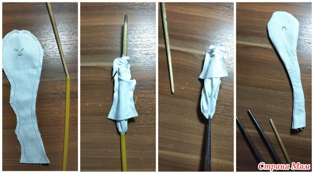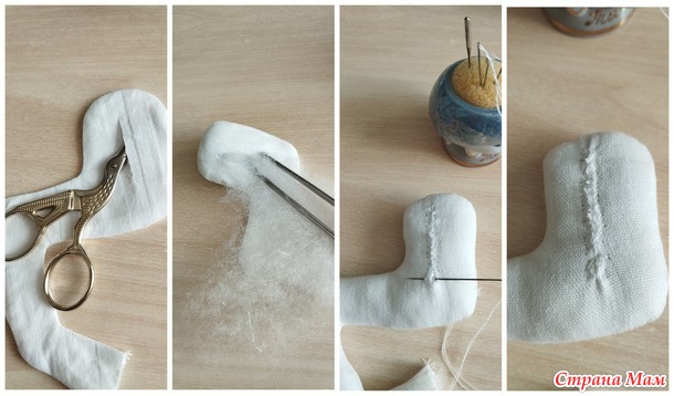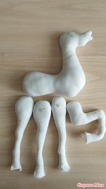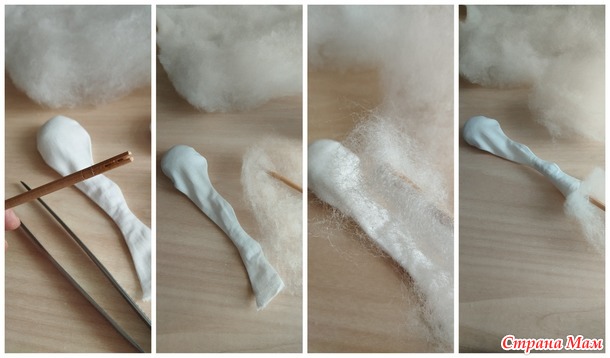 Для набивки лучше использовать синтепон ( он может принимать нужную форму и не пружинит). Набивать ноги можно снизу через не зашитое копыто или сверху, сделав надрез на внутренней стороне ноги. Ноги снизу набивать удобно палочкой от суши. На тупом конце палочки можно сделать прорезь, чтобы волокна синтепона не скользили по палочке. Синтепон нужно отрывать тонкими пластами и водить в ногу палочку с синтепоном вкручивающими движениями, тогда набивка будет ровнее.