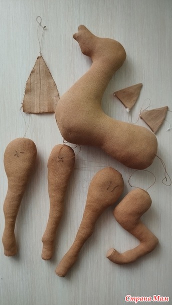 После высыхания стали видны полосы из-за разной плотности нитей. Пришлось наносить еще один слой кофейного грунта с добавлением краски. На фото видна разница в цвете грунтовки. Все запчасти игрушки прогрунтованы дважды. Первый грунт кофейный, второй кофе + краска. А рог только кофейным раствором.После полного высыхания нужно сшить все части. Так как наша игрушка будет статичной, то все ноги пришиваются сразу в нужном положении. Сначала примерьте, как будет стоять ваш Единорог, приколов ноги к телу портновскими булавками.