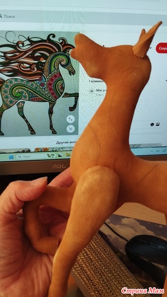Если у вашей лошадки одна нога будет поднята, то ногу, согнутую в колене, лучше набивать сверху. До колена через разрез на внутренней стороне ноги, а затем снизу до колена через не зашитое копыто. После набивки разрез зашить.