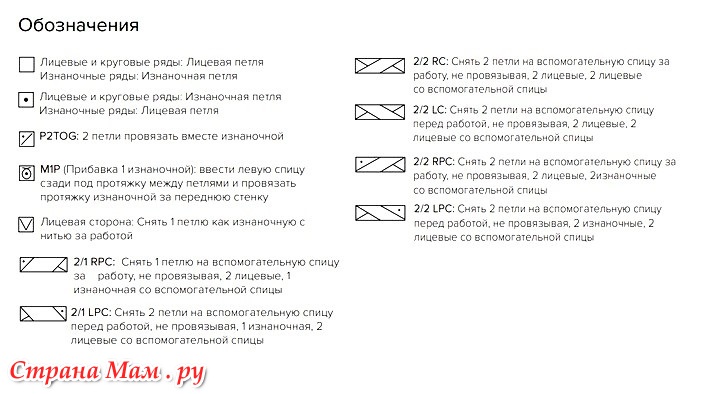 Прибавочный р.: *1 лиц., M1L, вязать по узору, не доходя 1 п. до М, M1R, 1 лиц., СМ; повторять от * ещё 1 раз.
