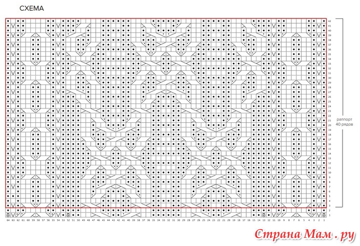 Установочный р.: 1 лиц., вязать поперечной резинкой (по кругу) след. 19 (27, 31, 35, 43, 47) п., ПМ, вязать по Схеме след. 64 п., ПМ, вязать поперечной резинкой след. 19 (27, 31, 35, 43, 47) п., 1 лиц., поместить боковой М, 1 лиц., вязать поперечной резинкой след. до последней п., 1 лиц.