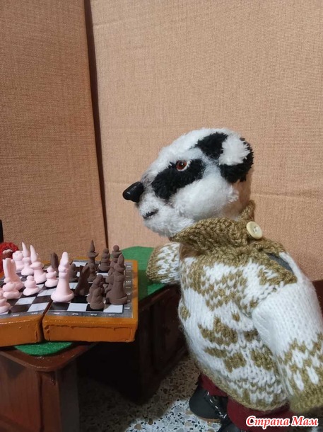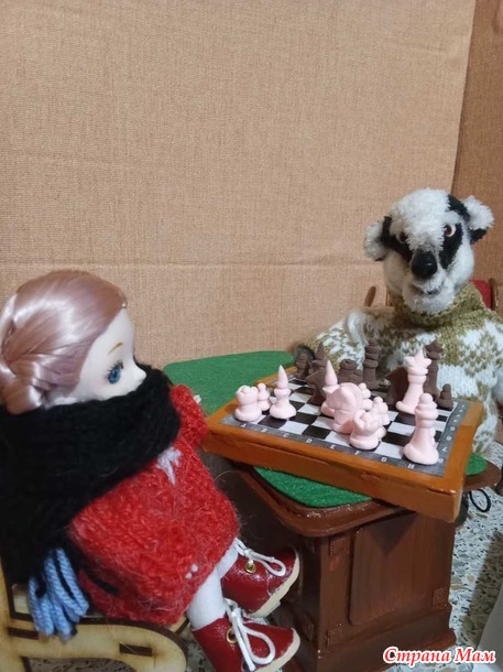 Наверное, сегодня постараюсь кратко. Без историй. Как говорится, по существу. Итак, сделано: шахматная доска, шахматы, лыжи с лыжными палками и вязаный свитер для лыжных прогулок для мистера Баджера; коньки с ботинками и вязаный свитер с шапкой для Алисы. В отчёте только фото, без сказок (это была старая редакция).