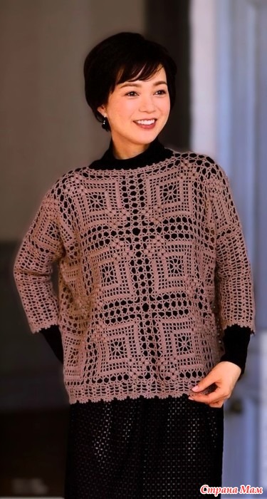Ажурный джемпер украшенный квадратными мотивами. Крючок.
