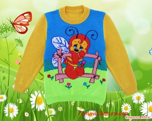 Наконец-то огородные дела подходят к концу. Можно заняться другим любимым делом и показать, что связала за это время. Сегодня "хвастаюсь" джемпером с очаровательной маленькой проказницей. Пряжа "Детский каприз", спицы 1,8 и 2 мм.