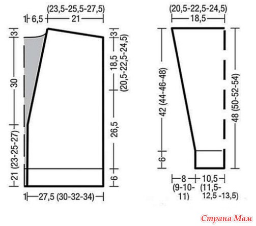 Для скосов прибавить с обеих сторон в 7-м р. от планки 1 раз по 1 п., затем 7 (8-7-6) раз в каждом 6-м р. и 0 (0-2-4) раза в каждом 4-м р. по 1 п. = 38 (42-46-50) п. Через 42 (44-46-48) см = 54 (56-60-62) р. от планки закрыть все петли.