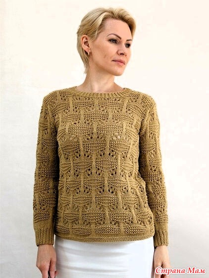 Через 56 см = 160 рядов (60 см = 172 ряда) от смены узора закрыть все петли, при этом средние 31 (39) п. образуют горловину, внешние по 19 (23) п. — плечи.