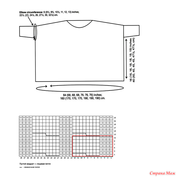 Очень интересный и очень простой в исполнении фасон, называемый «наволочка»: основную часть изделия вяжем очень широко — большим квадратом, — а рукава узкими облегающими. В данном случае, у нас рукава-резинка длиной 3/4.