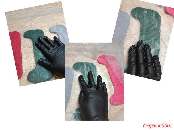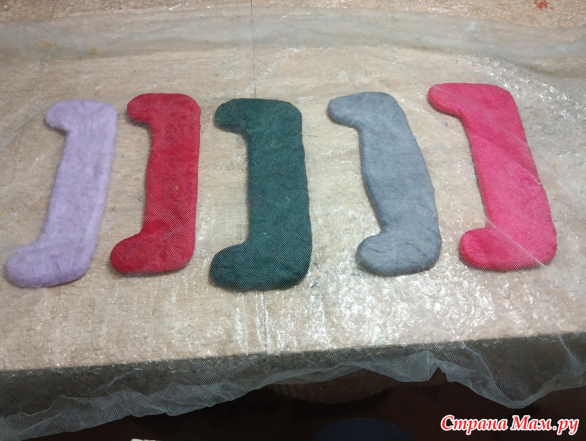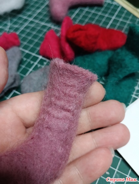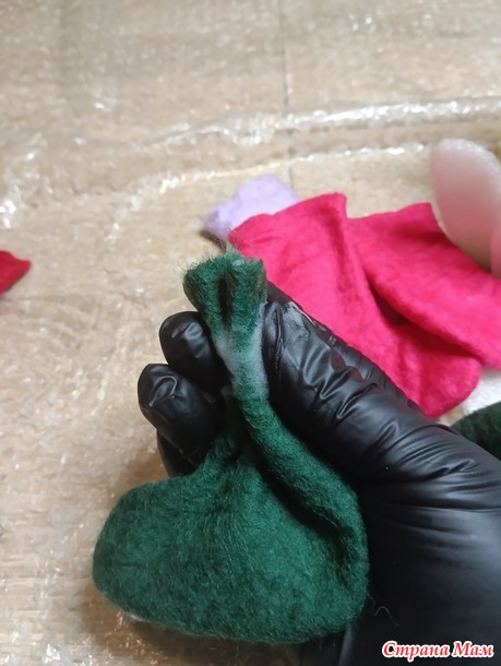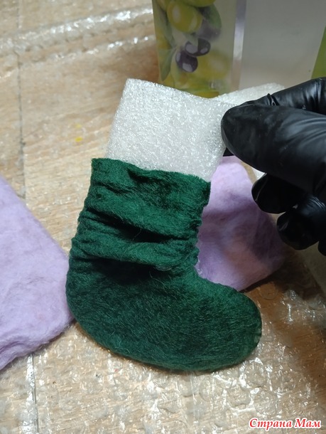Ну и осталось совсем немного)) Берем эту заготовку и можем ее помять в руках, уже можно интенсивно, но помяли немного потом просовываем внутрь пальчики и проглаживаем всё изнутри . Это делаем для того, чтобы внутренние слои не свалялись между собой и валенок не стал единым. Помяли, расправили изнутри, можно покидать, как дрожжевое тесто. Затем расправляем разглаживаем руками валеночки и смотрим результат, они стали уменьшаться, но правда форма очень смешная
