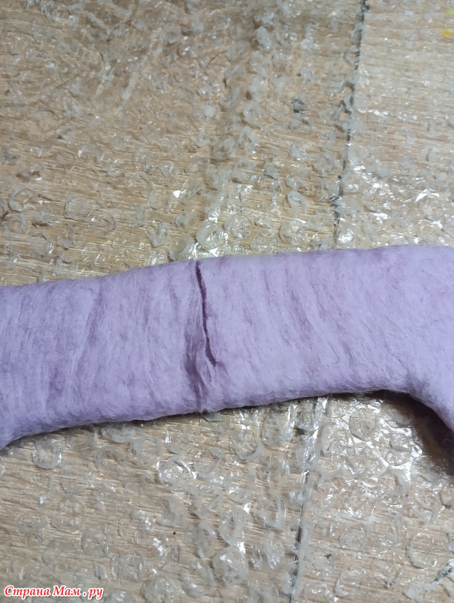 осторожненько , одной рукой, а второй помогаем пальчиками шерстке остаться на своем месте. От воды шерсть прилипнет к двум сторонам пупырки, наша задача, чтобы было так, как и лежит под пупыркой первоначально. И затем начинаем заворачивать шерсть на шаблон. Начинаем с изогнутых мест. Должно получится как на фото 2.- Поделиться