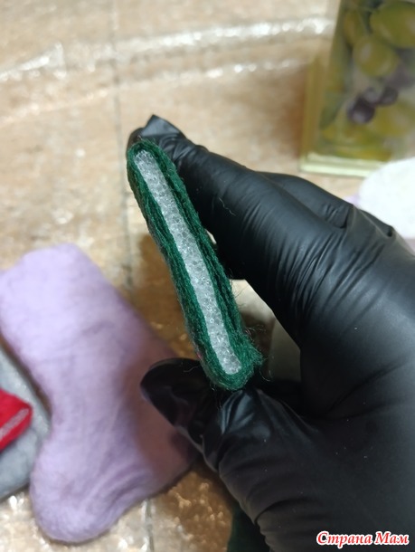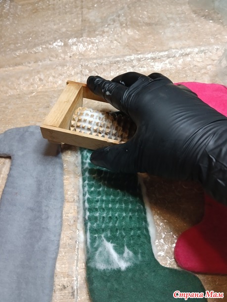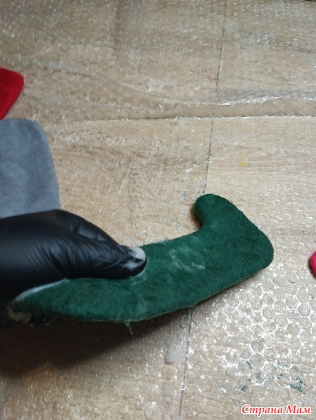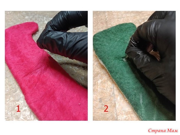 Далее, нам нужно проработать край валенка. Для начала, мы просто пальчиками протираем весь край, затем можно потереть о пленку.