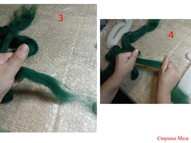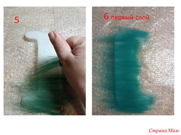 осторожненько , одной рукой, а второй помогаем пальчиками шерстке остаться на своем месте. От воды шерсть прилипнет к двум сторонам пупырки, наша задача, чтобы было так, как и лежит под пупыркой первоначально. И затем начинаем заворачивать шерсть на шаблон. Начинаем с изогнутых мест. Должно получится как на фото 2.
