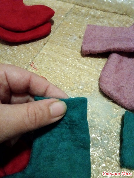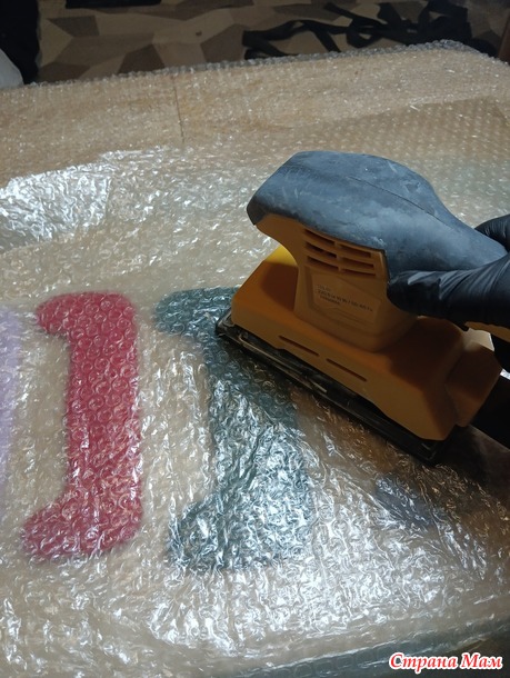Если у кого то есть виброшлифовальная машина, то можно процесс притирания ускорить. Только на сетку опять накрываем пупырку и проходимся машинкой по всему шаблону, это займет не более трех минут)) Но поверьте, такие маленькие валенки делаются спокойно и просто, только при помощи рук, на притирание уходит минут десять !!!!