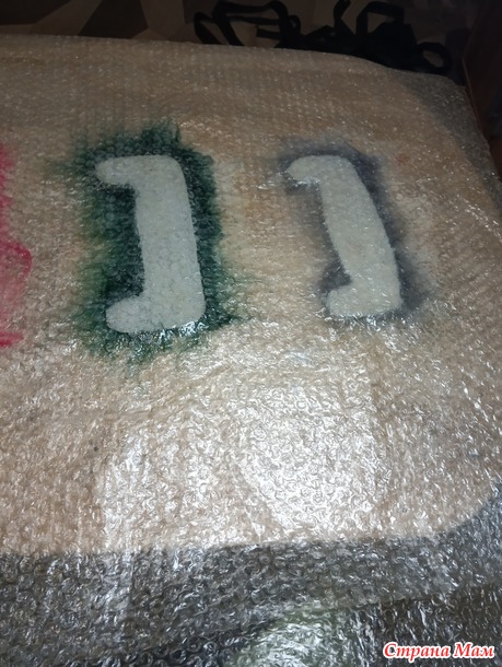 Накрываем пупырчатой пленкой получается, такой пирожок: пупырка снизу-шаблон-пупырка сверху и ладошками как бы приминаем шаблон, хорошо прижали, почувствовали, что водичка побежала по сторонам, руки приподняли, прижали в другом месте,опять таким образом разгоняя воду по всей шерсти, руки опять поднимаем, не водим руками по заготовке как утюгом