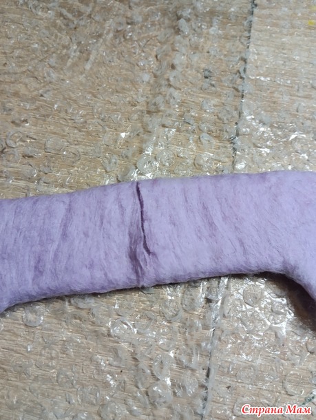 Если честно, то в отношении таких валеночков, я давно уже этот этап пропускаю, но новичкам советую, так шерстка быстрее сваляется и полотно будет более ровным. Когда прокатали, руками разглаживаем шаблон, проходимся по торцам.