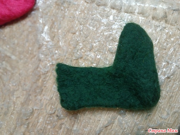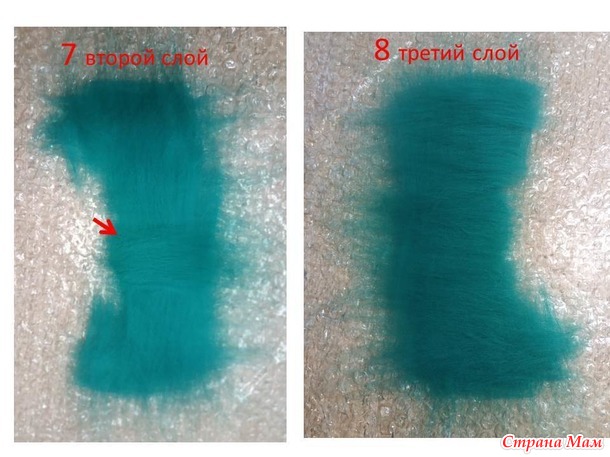 осторожненько , одной рукой, а второй помогаем пальчиками шерстке остаться на своем месте. От воды шерсть прилипнет к двум сторонам пупырки, наша задача, чтобы было так, как и лежит под пупыркой первоначально. И затем начинаем заворачивать шерсть на шаблон. Начинаем с изогнутых мест. Должно получится как на фото 2.Далее повторяем весь процесс сначала, делаем раскладку на половинке, куда только что загибали шерсть и проделываем тоже, что делали изначально. Получается, что шаблон у нас будет обернут с двух сторон шерстью