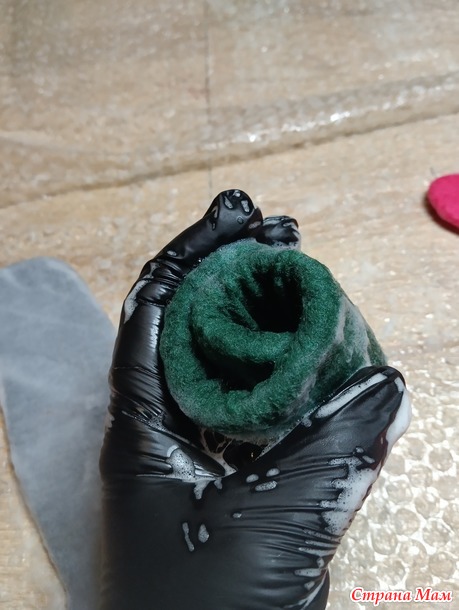 Потом край валенка собираем в гармошку и так же терем о пленку.