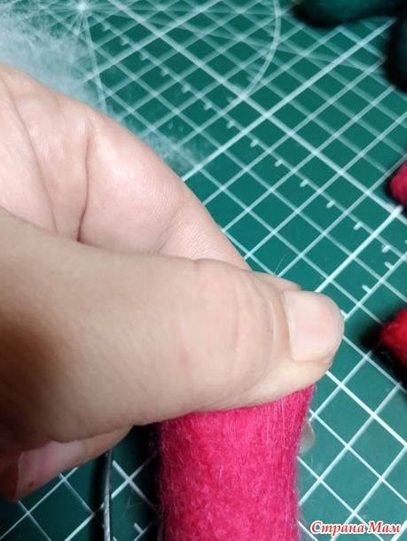 Далее, понимаем, что наша шерстка плотно села на шаблон, вы это почувствуете)) Значит пора разрезать заготовку пополам. Я это делаю двумя способами, если мне нужно сохранить основу-шаблон, то ножничками просто прищипываю серединку и разрезаю шерсть вокруг шаблона.
