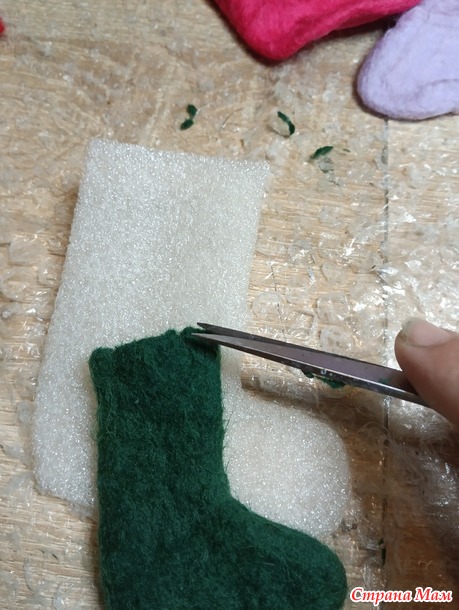 Теперь, нам нужно аккуратно снять валенок с шаблона. Делаем это так, присбориваем голенище и аккуратно вытаскиваем шаблон.