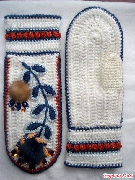 Варежки, связанные крючком, украшенные вышивкой, бисером, стразами, меховыми деталями и помпончиками - просто восхитительны!