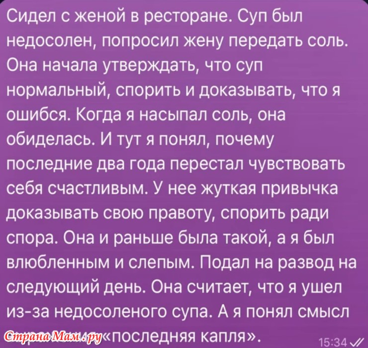 Ты не можешь жить с человеком, который постоянно, постоянно, постоянно пилит тебя, что ты всё делаешь неправильно, что ты тряпка, что тебя никто не уважает, что ты должен слушать её, как надо поступать, а вот ты не послушался её, грамотную, и сейчас всё плохо и так далее и тому подобное с утра до вечера. Это просто отрава какая-то которую тебя постоянно каплют в уши.
