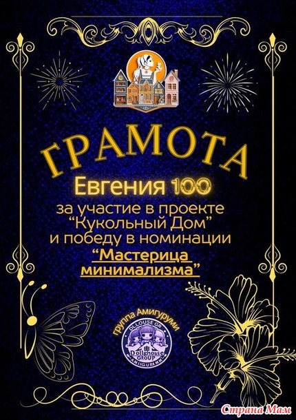 Грамота для участницы №38 mayakova l и букет цветов от Кукольного дома