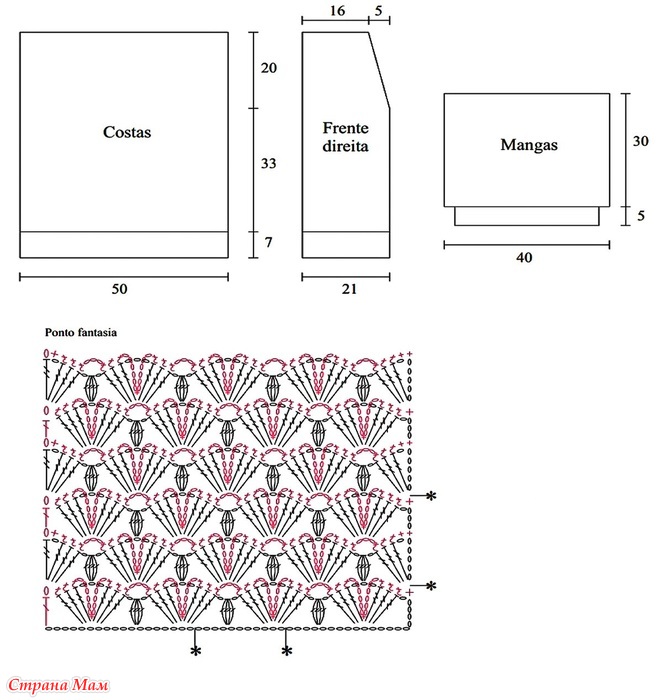Пастельно-розовый кардиган оверсайз, связанный объёмным и одновременно сетчатым узором. Манжеты, отделка по низу и широкая планка — обычные столбики без накида. Прямой фасон до бедер, широкие рукава на узкой манжете и небольшой V-образный скос горловины.