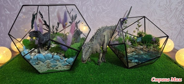 Доброго времени суток! Летом в группе проходил конкурс "Вот оно какое наше лето" и я тогда делала флорариум "Лето в парке юрского периода". Это был кусочек задумки, наконец дочка всё доделала и вот что получилось.