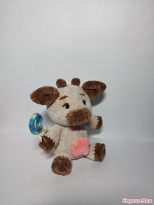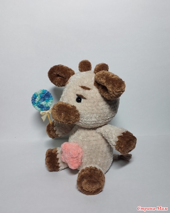 Коровка связана из плюшевой пряжи Лавита Велюр, крючок 3,5 по МК Натальи Титула из вк. Рост игрушки 15 см без рожек, устойчиво сидит. Конфетка-леденец связана из Джинс Крейзи Колор, крючок 1,75 по бесплатному описанию из сети, диаметр 3,5 см.